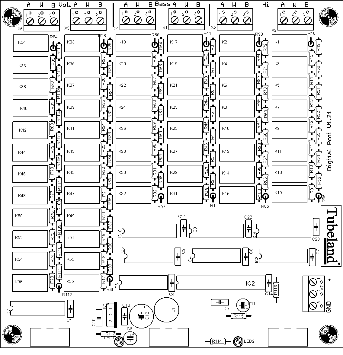 Der Tubeland Reference Tone & Volume Controller kombiniert eine hochauflösende 12-Bit Relais-Lautstärkeregelung mit einer präzisen 8-Bit Klangregelung für Bass und Höhen – vollständig diskret aufgebaut, ohne Audio-ICs im Signalweg.