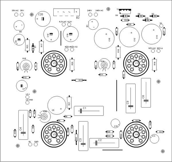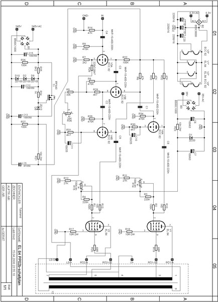 Ziel war auch minimierte Stör Geräusche. Also entschloss ich mich alle Röhren mit DC zu heizen. Am Gleichrichter B2 werden 6,3V AC eingespeist. Die Kondensatoren C 18-20 wurden so ausgewählt, das unter last aller Röhren die Heizspannung leicht über 6,3V DC liegt.