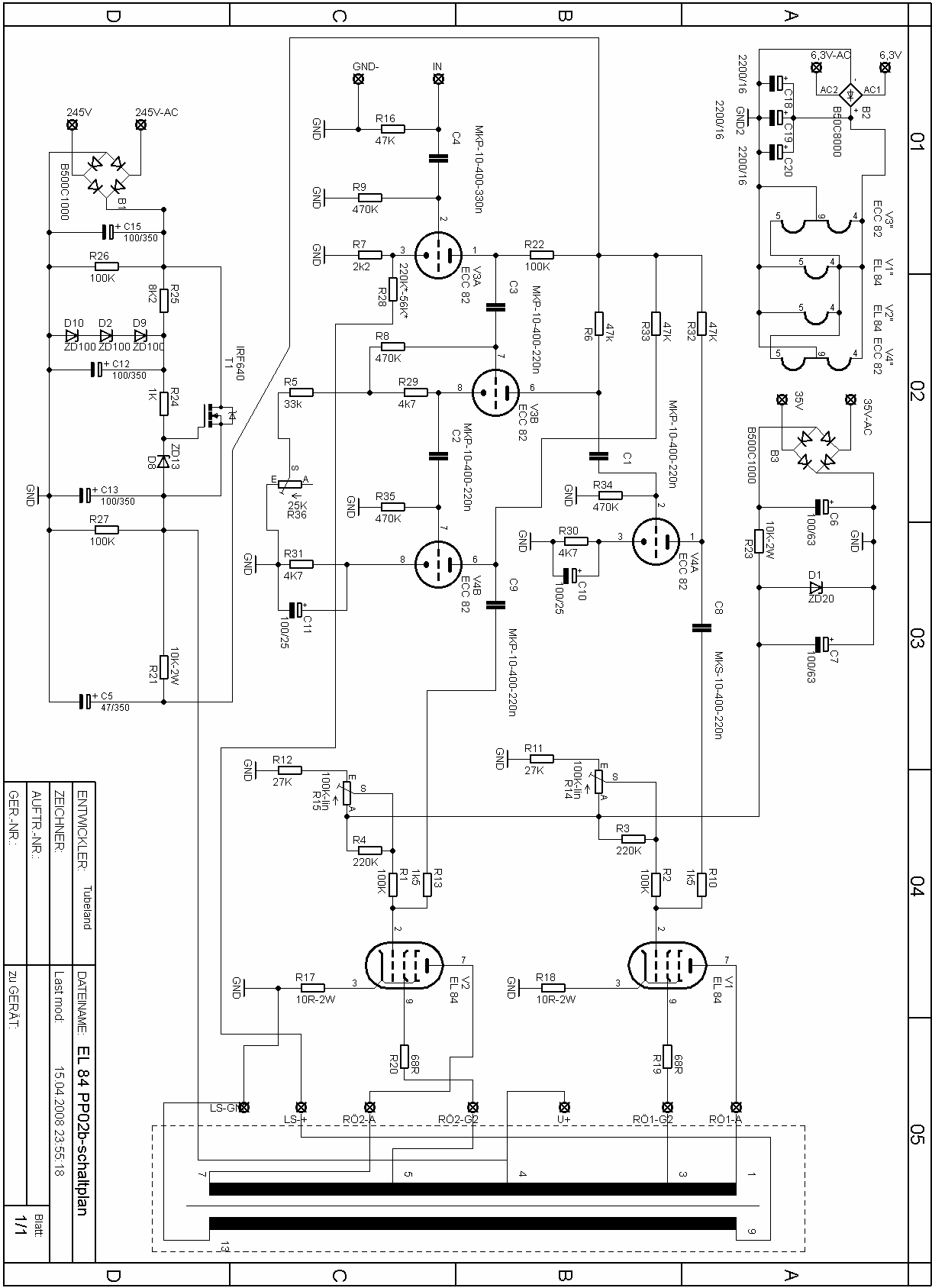 Auf den ersten blick Sieht die Schaltung wie Üblich aus nur das hier Satt der ECC 83 die sonst sehr oft für eine EL 84 gewählt wird hier ebnend die ECC 82 gewählt wurde. Sie ist Niederohmiger als die ECC 83 Anders ist auch hier wie sonst die Art der Phasen Abgleichung. Diese geschieht Direkt beim Pfasensplitter. Die Ströme sind hier geringer als bei den Treibern. Somit ist auch das Poti weniger belastet.