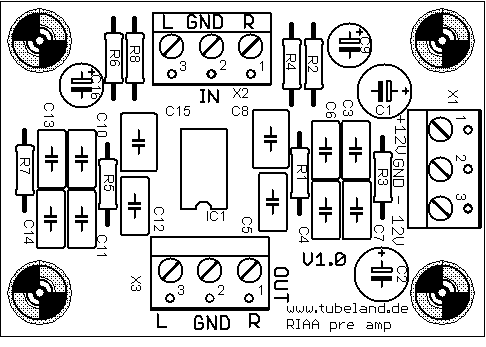 Weitere Future sind natürlich die beiliegenden metallfilm Widerstände, sowie die Folienkondensatoren die für die RIAA Kennlinie zum Vorteil sind. Denn der Filter Sollte von guter Qualität sein. Somit bildet dieser RIAA Entzerrer eine sehr gute Standard Baugruppe. Je nach Tonabnehmer und Pre Amp kann es sein das die Verstärkung etwas angepasst werden muss. Wir versenden 100R und 180R Widerstand, damit sie dann entscheiden können Veiel der Entzerrer verstärken Soll!  Sie Können für den Betrieb der Schaltung unser Audio Netzteil mit +/-12V bzw. +/-15 6VA einsetzen.,