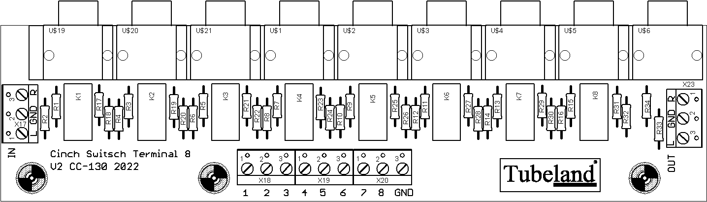 Das Board wurde so gestaltet, dass am ersten Eingang alternativ ein Plattenspieler betrieben werden kann. In diesem Fall werden die ersten zwei Cinch-Buchsen weggelassen. Der RIAA-Entzerrer wird an Klemme X17 angeschlossen. Die Phonoeingänge werden dann mit dem RIAA Entzerrer verbunden. Zwei weitere Isolierte Cinch Buchsen werden dem Gehäuse dann Spendiert. U$6 ist nur von Nöten wenn sie einen Direktausgang für z.b. eine Aufnahmequelle nutzen wollen. Über X23 speisen sie dann in den Vorverstärker ein und die Ausgänge wie beim RIAA über zusätzliche Buchsen. Sollten sie Die Leiterplatte als eigenständiges Gerät ohne weitere Elektronik Nutzen Wollen so müssen sie die Masse ( GND) vom ein und Ausgang miteinander verbinden in dem sie einen Lötpunkt von U$5 zu U$6 setzen!