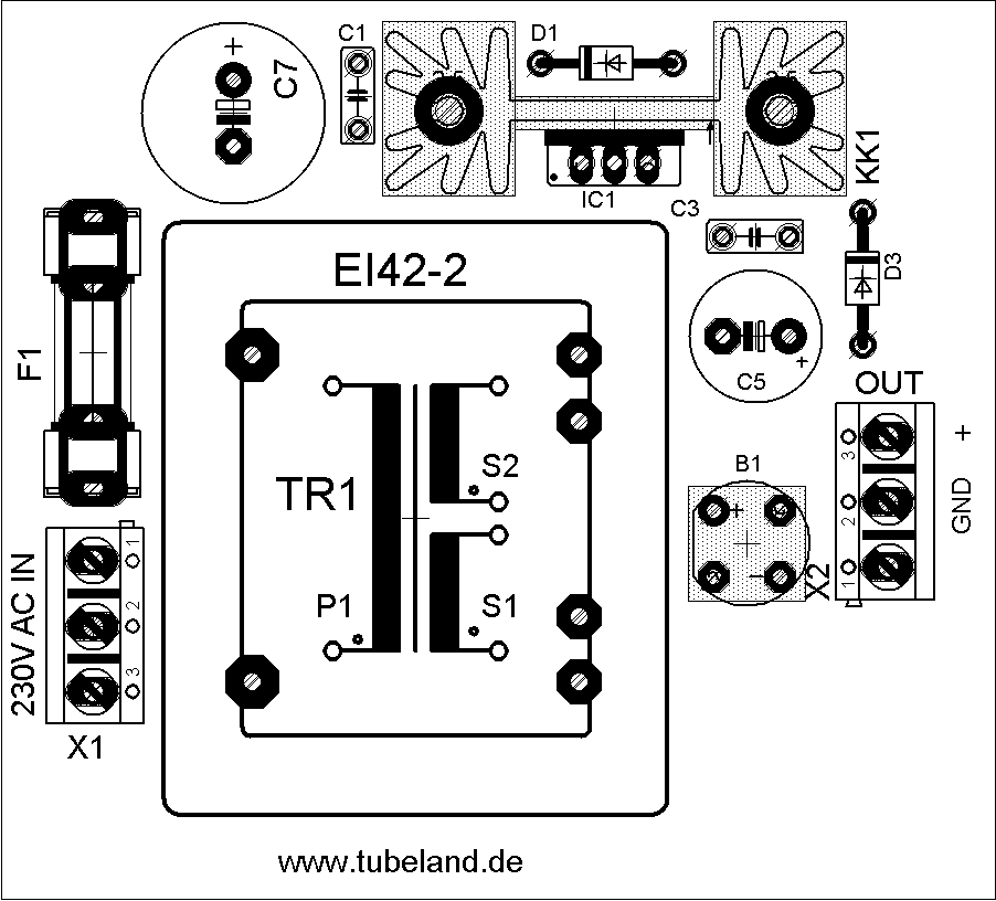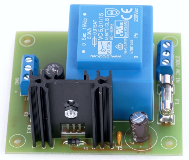 Es liegt 230V Netzspannung am Trafo an. Dementsprechend muss die Schaltung berührungssicher im Gehäuse, nach den geltenden Richtlinien, verbaut werden.