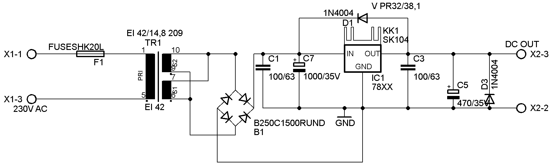 Es handelt sich hier um eine Netzteilschaltung, ausgestattet mit dem 78xx-Festspannungsregler, der es ermöglicht, mit geringem Aufwand, hochwertige Netzteile zu realisieren.