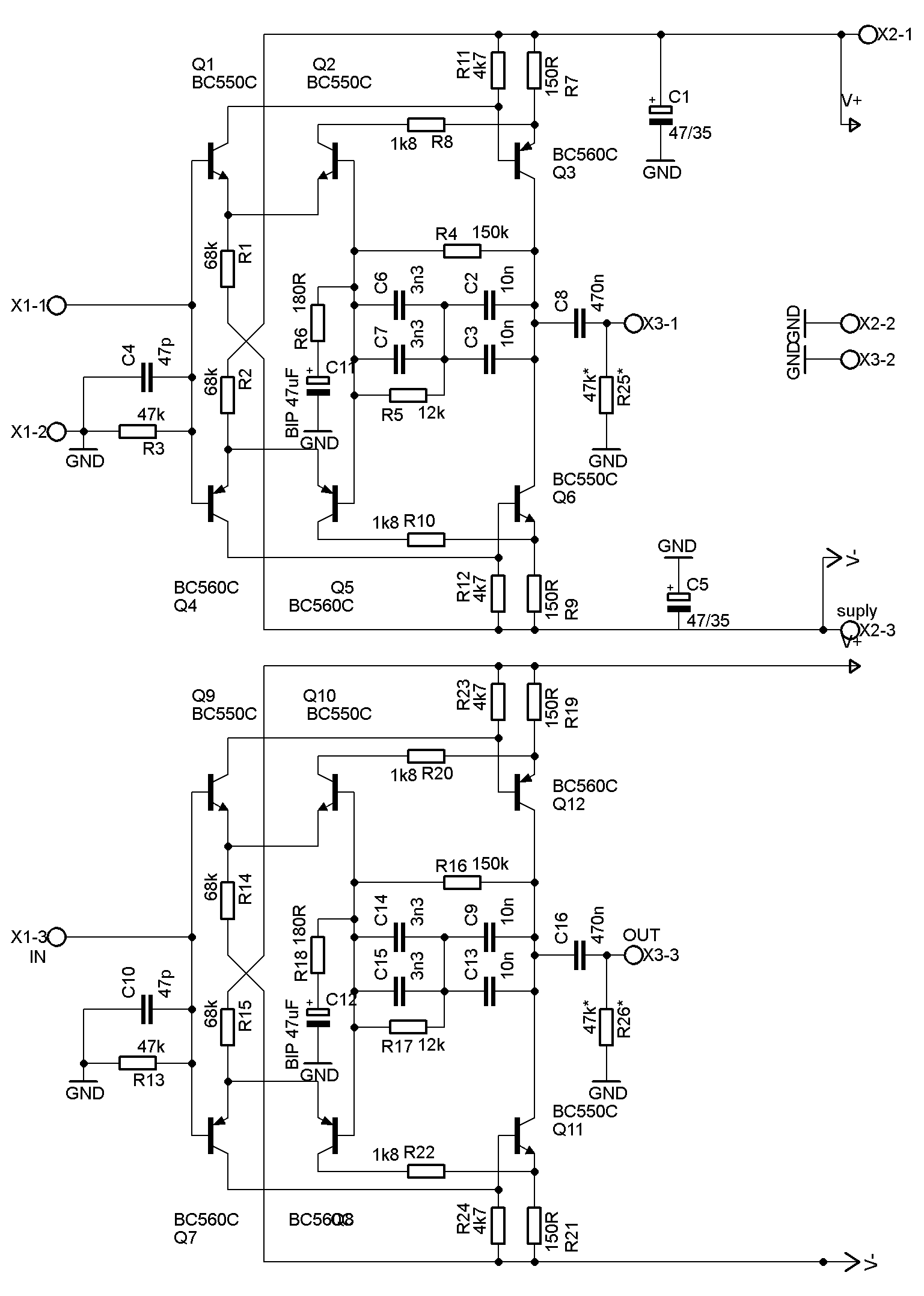 Um möglichst niedrige Ruheströme und einen geringen Fremdspannungsabstand zu realisieren, wurde die Schaltung mit Transistoren realisiert. Dies trägt zu einem möglichst geringen Grundrauschen bei.