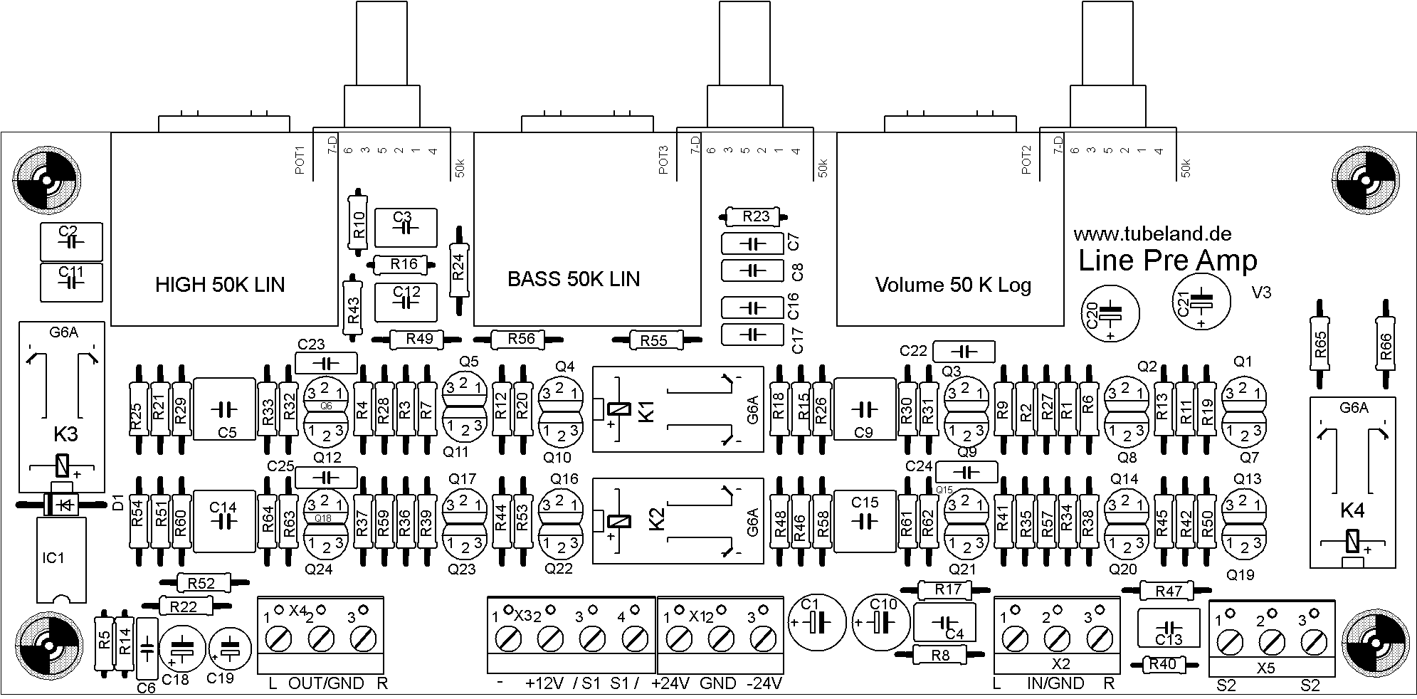 R65,R66 können Über das Relay dazugeschaltet werden. Dann kommen +15,4db am Pegel dazu 10k Reichen in der Regel aus um einen RIAA Entzerrer der in etwa eine Verstärkung von gute 35 – 40 db macht. Ziel ist es das der Phono Eingang dann genauso Laut ist wie der CD Player! Da sowieso auch noch ein Signalquellenwahlschalter von Nöten ist der dann meist mit hochwertigen Relais Ausgestattet ist. Wird dann das Relay K4 mit dem Eingangswahlschalter verbunden.