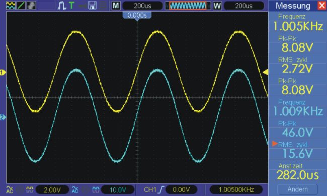 Auf dem Bild zu erkennen die Eingangs Amplitude mit der Betriebswahl +15,4db ( Gelb) Blau zeigt die Mögliche Ausgangsamplitude an. In der Praxis wird meistens nicht mehr als 775mV bis ca. 1,5V benötigt um einen Verstärker Voll auszusteuern. Somit gibt es genug Reserven für die Klangreglung. Das heißt. Selbst wenn der Eingangspegel sich bei 2,72V RMS bei Vollaussteuerung befindet würde bei einer 14db Höhen und Bässe Regelung die Schaltung noch nicht verzerren! Das Können die aller Wenigsten Vorverstärker! Standard ist das in der Studio Technik Bei Seht Teuren Konsolen.