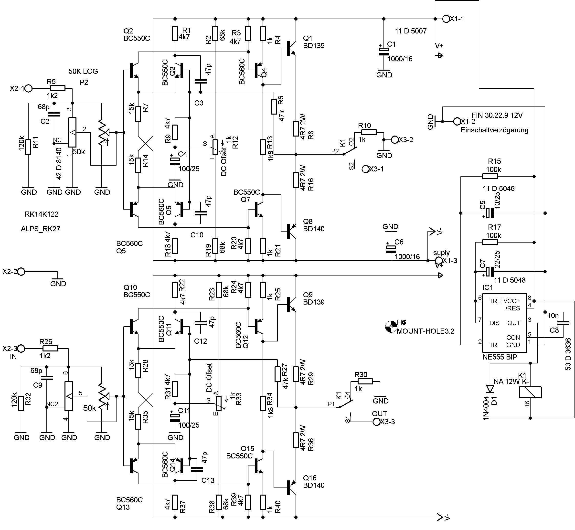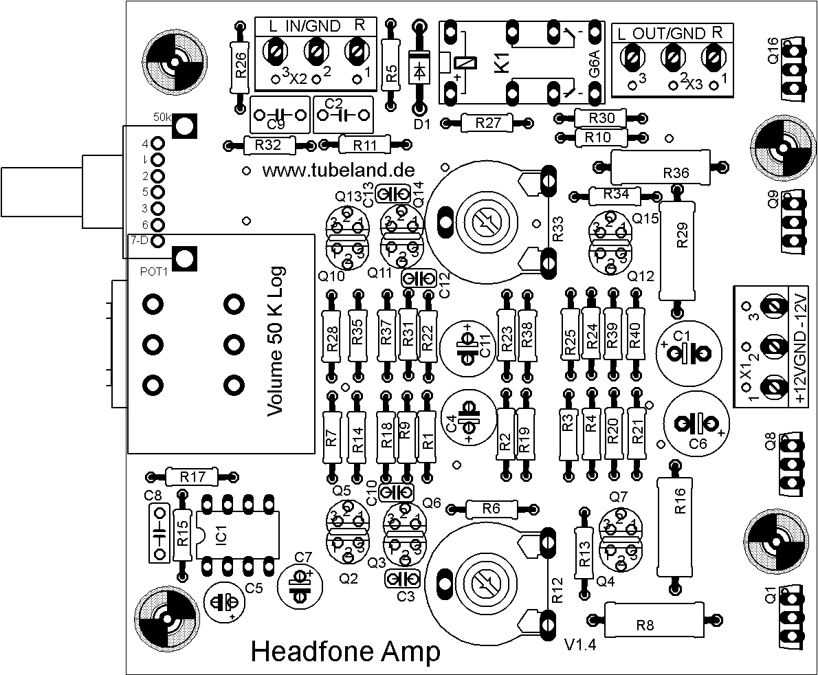 Diese Verstärkerschaltung kann Impedanzen von 16 – 600 Ω verarbeiten und tut dies weitgehend in Class A. Das bedeutet konkret, dass die Schaltung bei 16 Ω 100 mW in Class A (1000 mW Class AB) wiedergeben kann und bei 600 Ω im vollen Umfang in Class A läuft. Eine Einschaltverzögerung verhindert, dass beim Einschalten hohe Gleichspannungsanteile an den Kopfhörer gelangen und Ploppgeräusche verursachen. Die Auswahl der Transistoren fiel bewusst auf die legendären BC 550C, BC 560C sowie das Paar BD139 und BD140, da diese Typen besonders gut für Audiozwecke geeignet sind. Um unnötigen Induktivitäten vorzubeugen, wurden Metallfilm-Widerstände verwendet. Natürlich kann auch hier zwischen den Standard-Alps und der Highend-Potis gewählt werden.