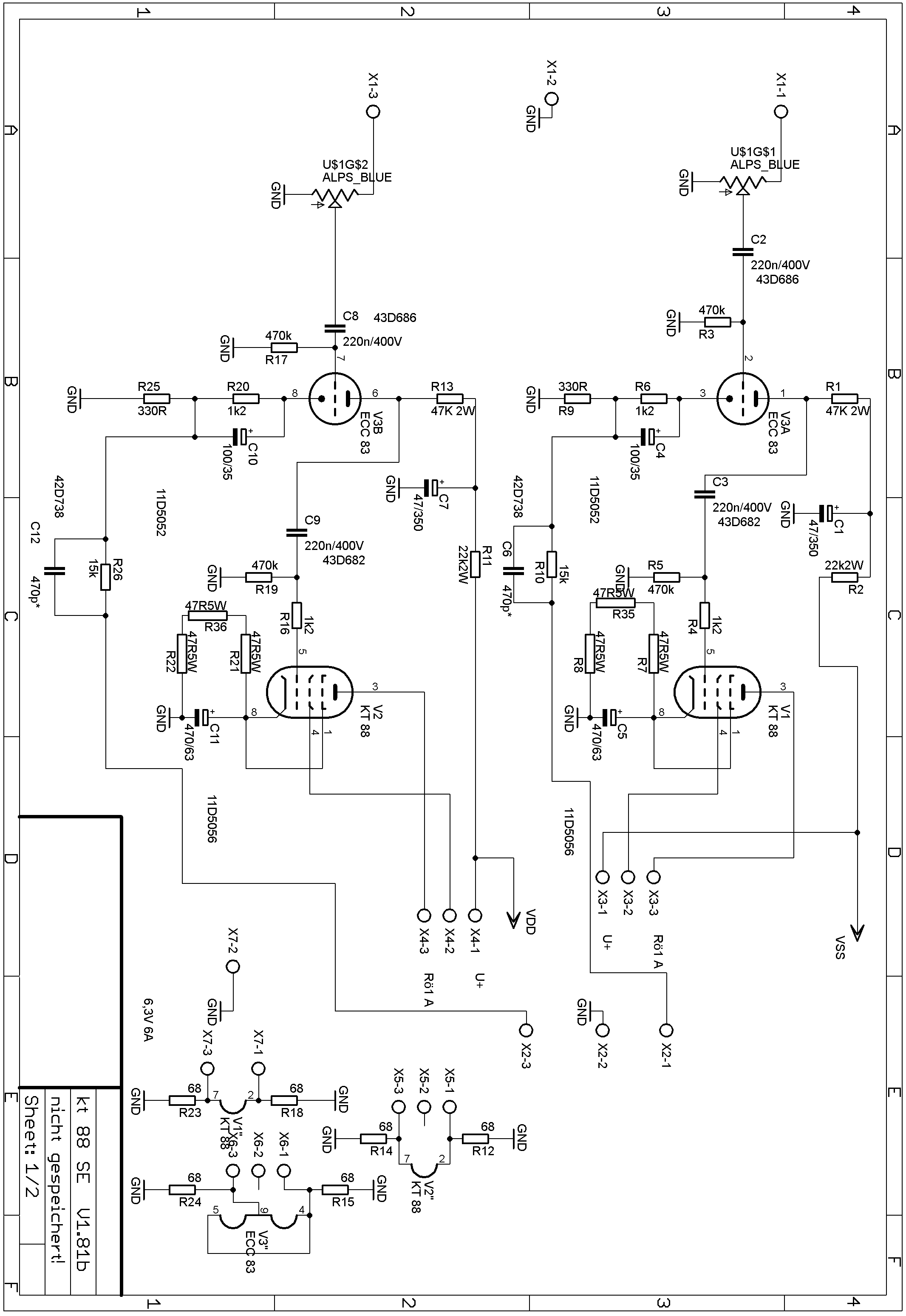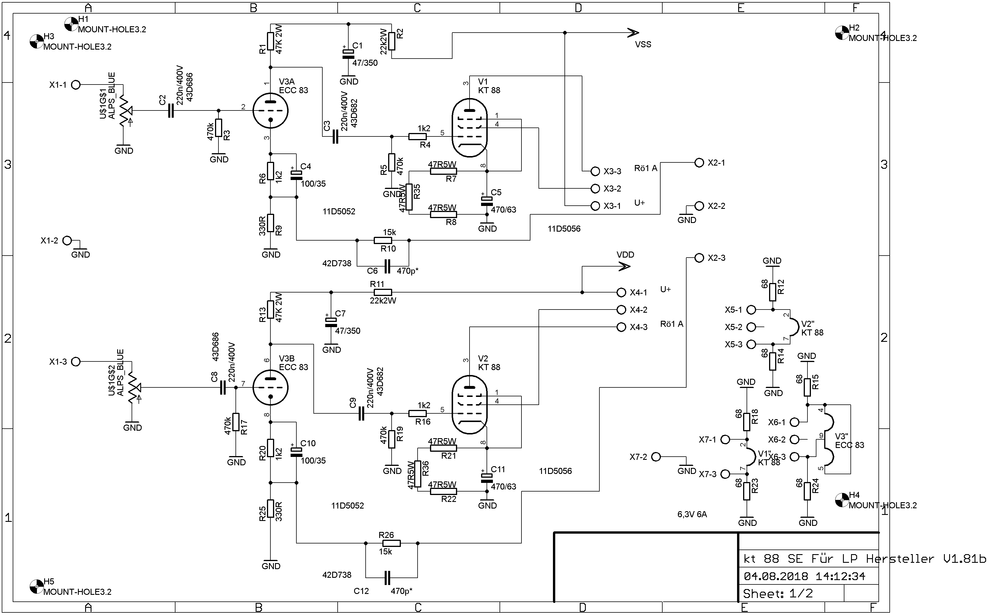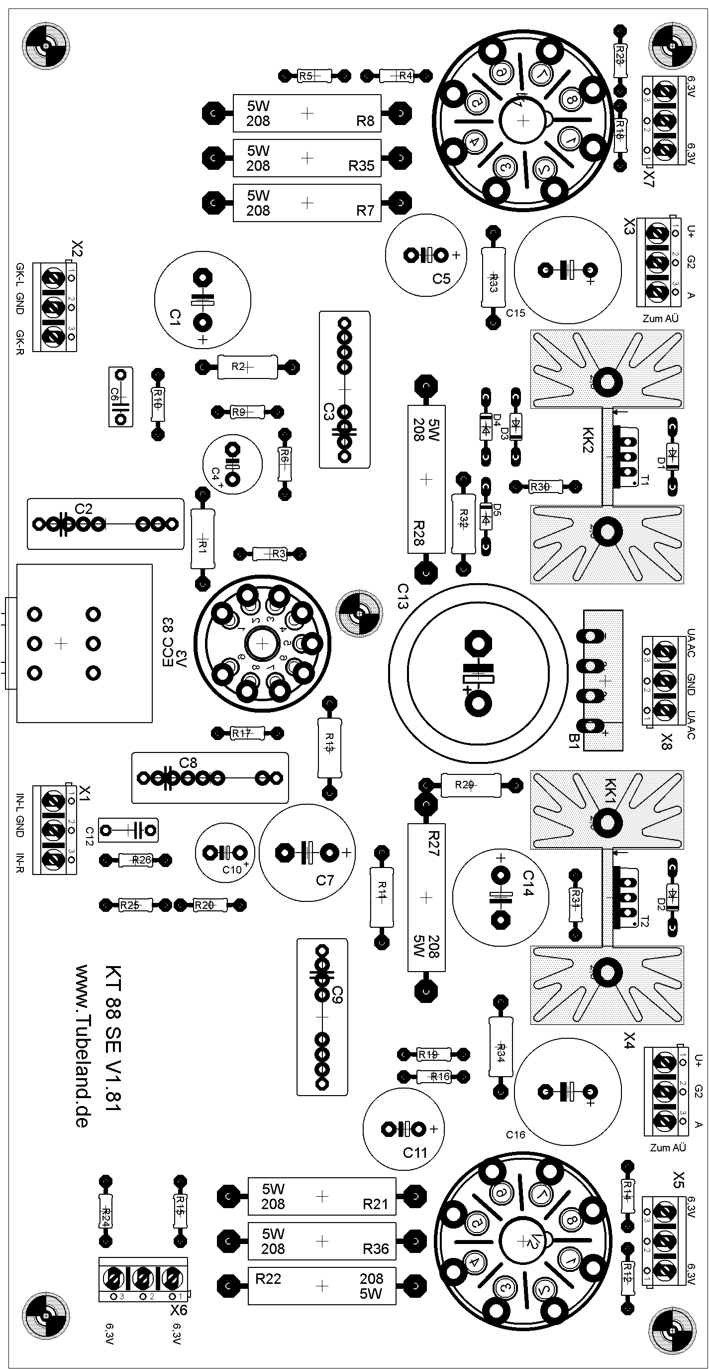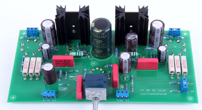 Ein KT 88 SE Amp mit nur eine Leiterplatte und Netzteil kit on Board. Das Board wurde so ausgelegt, so das auch Projekte mit Diversen Röhren wie die EL 34, KT 66, KT 88, KT 120 etc. eingesetzt werden kann. Möchten sie andere Röhren einsetzen ist darauf zu achten das die Pin Belegung der Verwendeten Röhren identisch ist mit der KT 88 bzw. ECC 83.