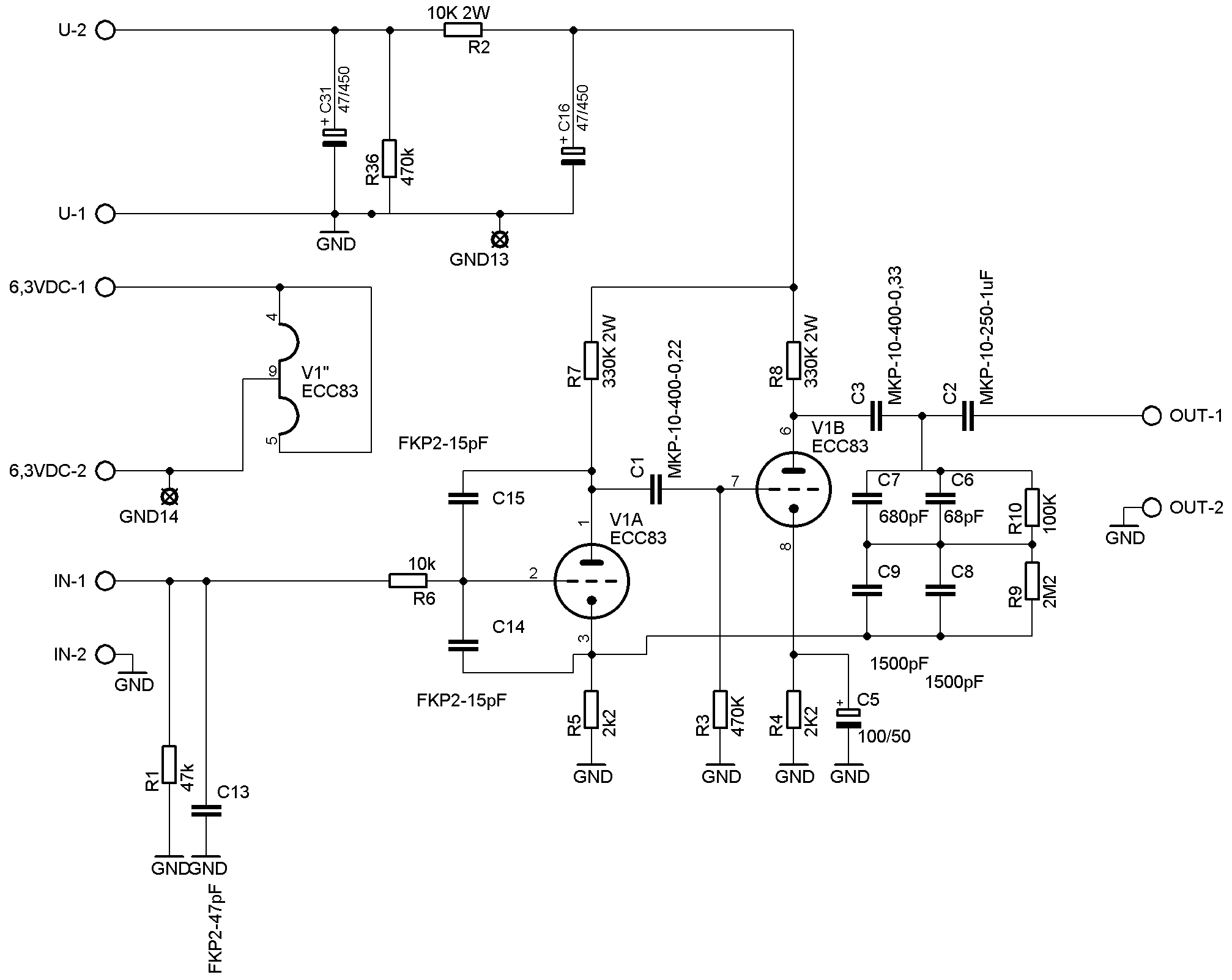 R7 und R8 wurden mit 2W Metall Oxide Widerstände versehen um das Rauschverhalten der Widerstände möglichst tief zu halten. Nachfolgende Stufen würden sonst das Rauschen mit verstärken!