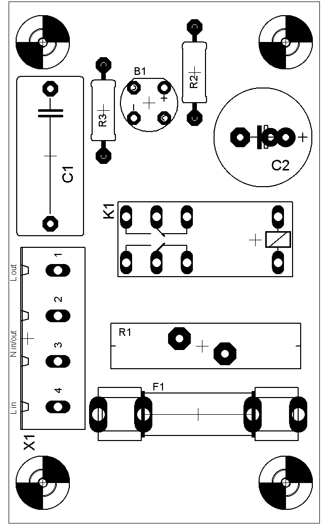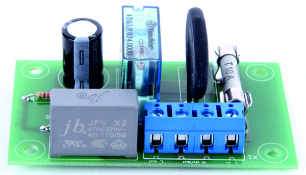 Mit Hilfe eines Hochleistung NTC wird der Strom begrenzt. Ein Zusätzliches 16A Relay schaltet dann bei 1000 µF ungefähr in 0,5 sec. Verzögerungszeit. C2 ist mit RM 5 und 7,5mm Ausgestattet um ggf. wenn erforderlich die Verzögerungszeit zu erhöhen. In der Regel Reichen 0,5 Sec. aus.
