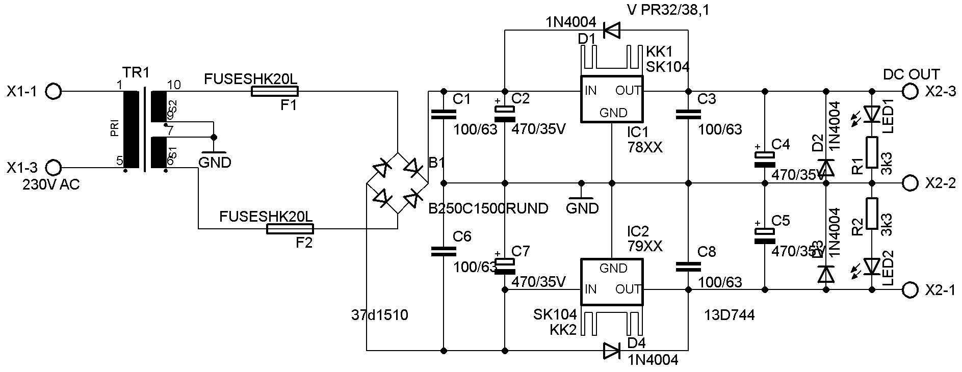 Es Handelt sich hier um eine Netzteil Schaltung, ausgestattet mit den 78xx und 79xx Spannungstabilisatoren. Diese Bauteile gibt es in Verschiedene Ausführungen. So Können Hochwertige Netzteile mit Wenigen Bauteilen Realisiert werden.