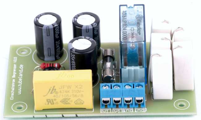 Drei Kondensatoren bestückt werden Je 1000 µF ist mit einer Verzögerung Von 0,5 sec. Zu rechnen. Das Reicht eigentlich auch schon damit ist der Trafo beim Einschalten schon gut Bedient. Für den Fall das Die Röhren auch leicht Angewärmt sein sollen werde 3 Kondensatoren eingesetzt mit einer Gesamt Kapazität Zwischen 1000 µF – 6600 µF.