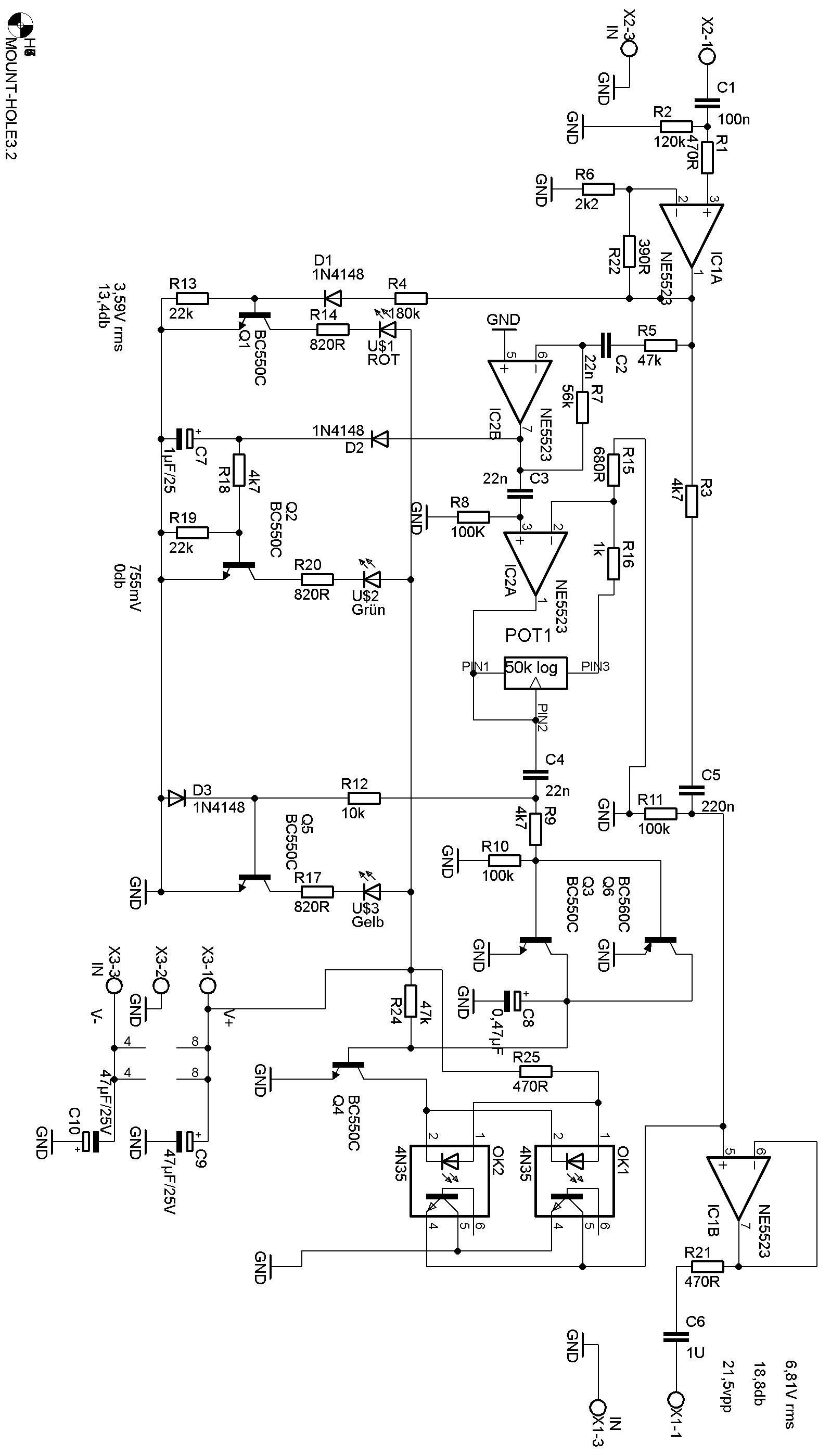 IC1A ist auf 1db gewinn eingestellt (R6 und R22) das Signal Läuft quasi durch bis zum Ausgang. Wenn hier nicht gerade geblockt wird. Das bloggen von Stör Geräusche Übernehmen die OK1 und OK2.