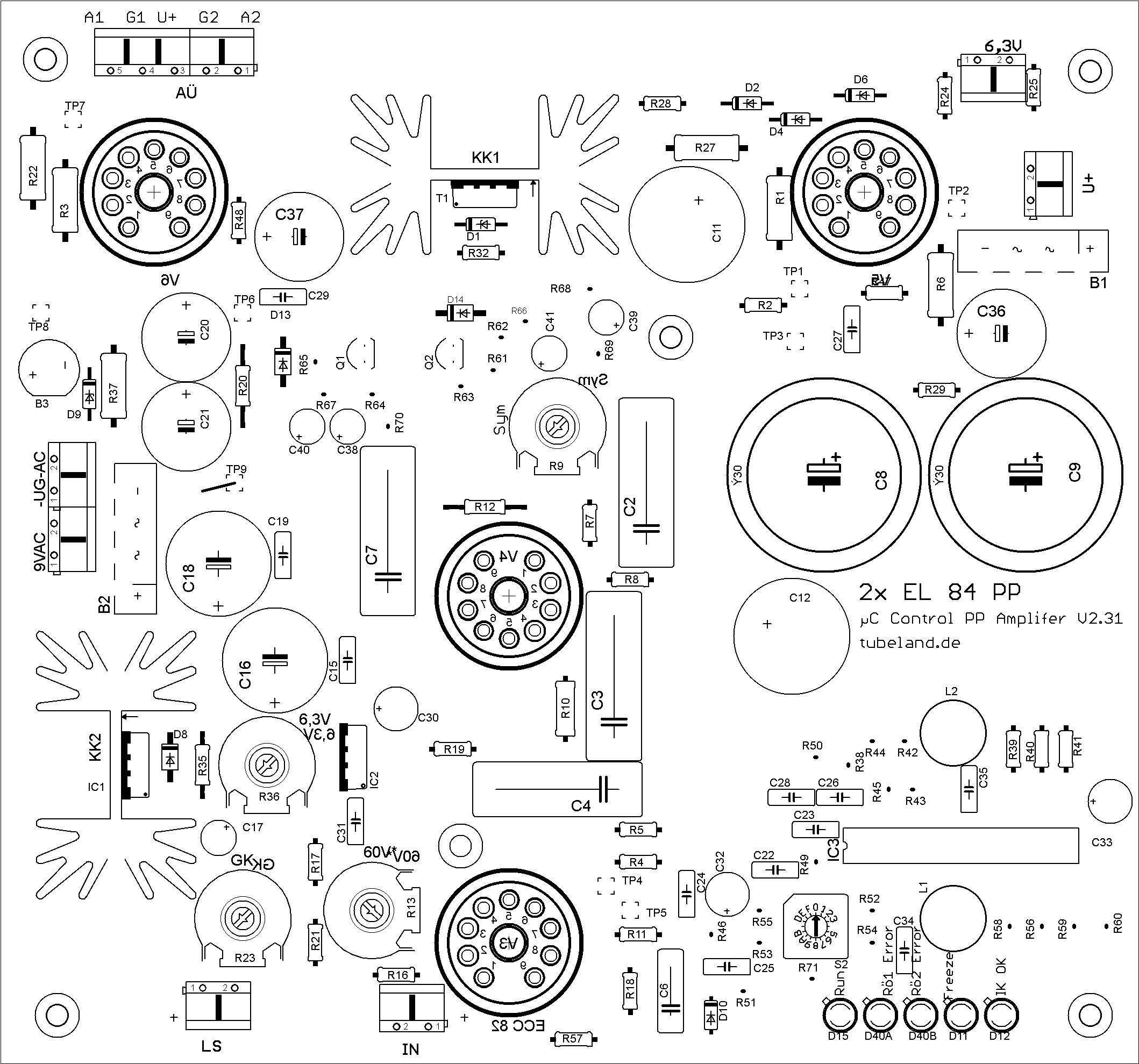Ist alles Installiert und ordnungsgemäß Verdrahtet, fangen wir erst einmal an zu überprüfen ob auch alle Spannungen vorhanden sind. Vor allen die negative Gittervorspannung an Pin 2 der Endröhren anliegt. Sie Schalten den Amp dazu ein und Messen an Pin 2.(TP2 und TP6 gegen GND) sofort nach dem Einschalten. Sie haben dafür nur 45 Sec. zeit. Danach fängt der Regler an zu Arbeiten und Regelt sie -UG herunter! Das ist auch normal, wenn keine Endröhre Steckt! Sind alle Spannungen vorhanden. Werden zuerst die Vorstufen Röhren gesteckt. Sie Können auch das Loslaufen des Regler verhindern in dem sie die Anodenspannung noch weg lassen!