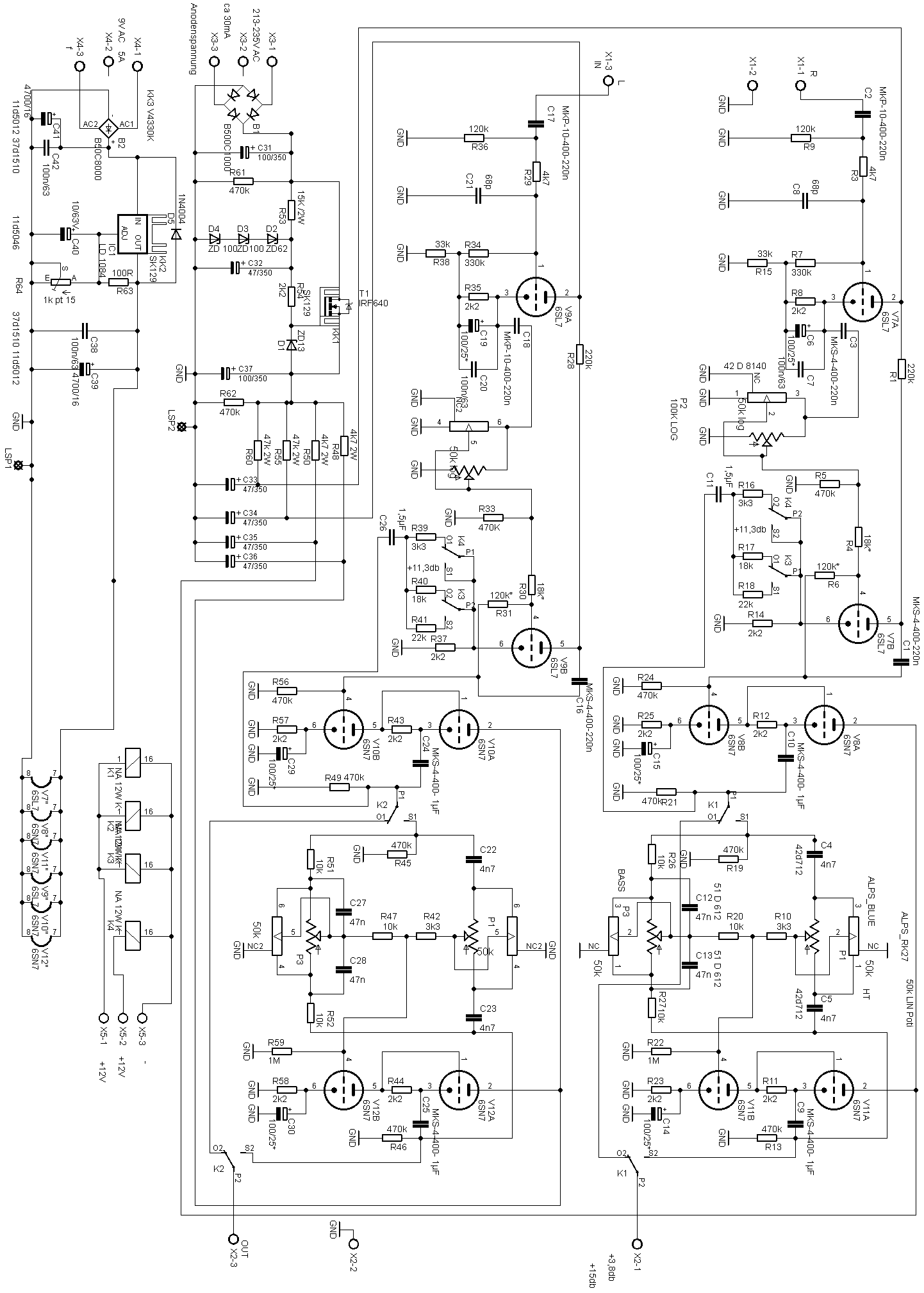 Die Vorstufe mit der 6SL7 Läuft als Katodenfolger. Die Endstufe sowie die Klangregelung ist mit der 6SN7 Als SRPP Stufe Aufgebaut.