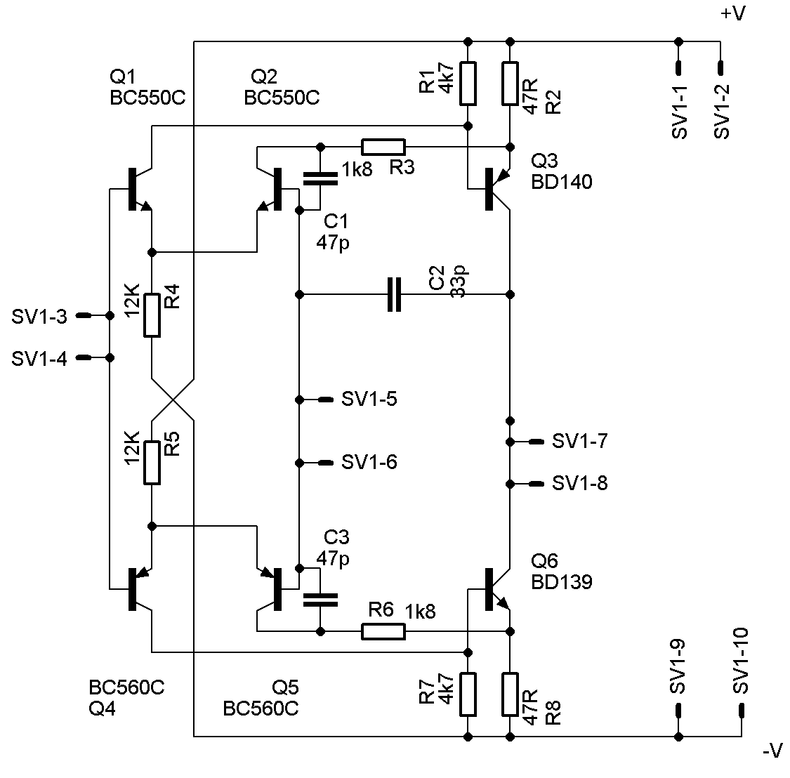 Für  15V R4 und R5 legen wir auf 12k genug für Q3 und Q6 das ein Ruhestrom von ca. 31 mA erreicht wird. Die Schaltung ist jetzt viel Niederohmiger und nun auch in der Lage niederohmige Lasten anzutreiben wie z.b. einen Kopfhörer. Verbraucht aber auch nun etwas mehr Strom, da die Schaltung in Class A Läuft!