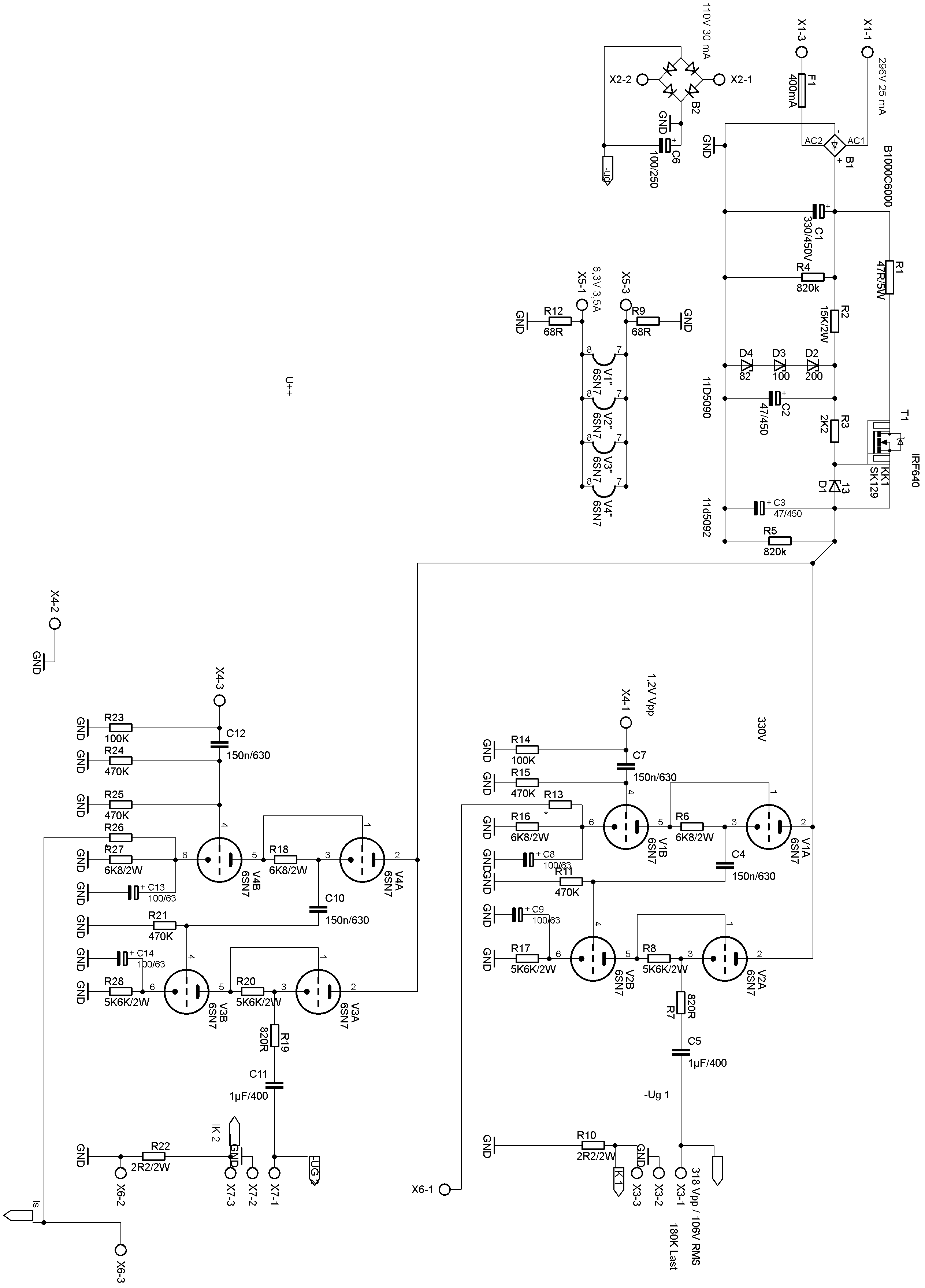 Die Anodenspannung für die Endröhren wird direkt an die Übertrager angeschlossen Die Anode Wird an den Übertrager Angeschlossen. GND von den Endröhren Netzteil wird mit X3 Bzw. X7 Verbunden. Die Anodenspannung wird damit der Regler los läuft an X8 Angeschlossen.