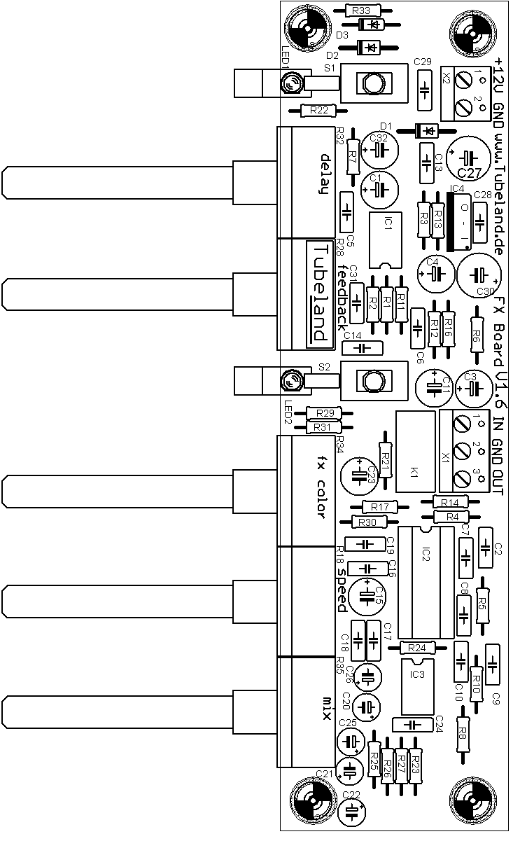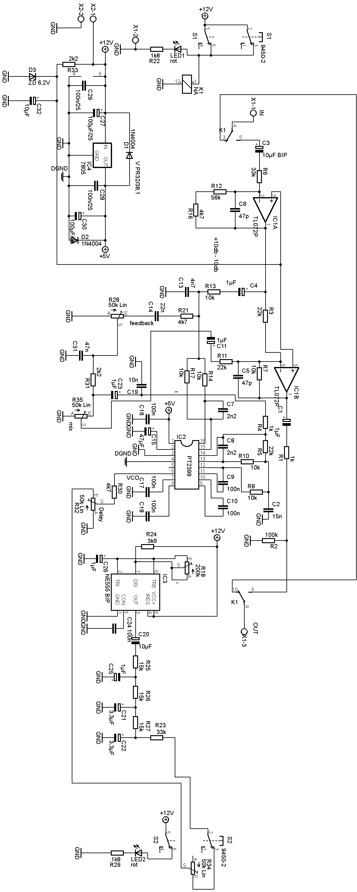 Beim ersten Prototyp hatte ich Das Signal direkt auf Pin 7 (IC2) gelegt. Das war mir dann zu intensiv, wobei dann bei den Längeren Delay Zeiten der erzielte Effekt dann zu stark übertrieben wirkte. So kam mir dann die Idee die Modulation einmal an R32 an zu klemmen.