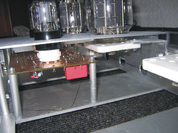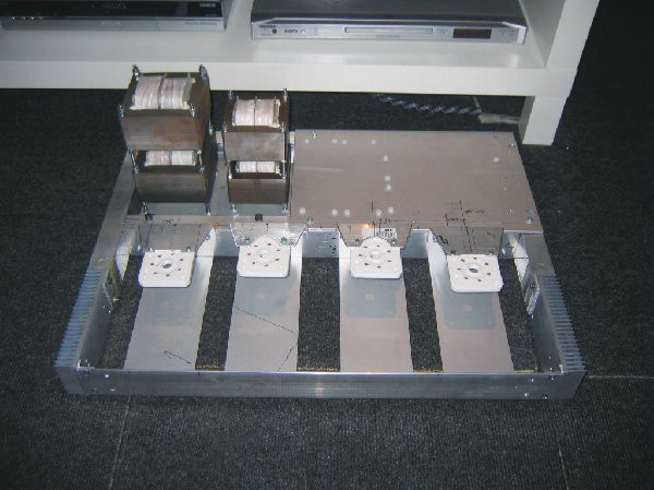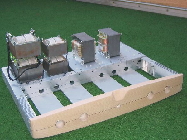 Im Hinteren teil des Grundrahmens ist eine Aluminiumplatte mittels Gummipuffer am Rahmen hängend montiert, worauf die Netztrafos befestigt werden und diese dort mechanisch vom Rahmen entkoppelt sind!
