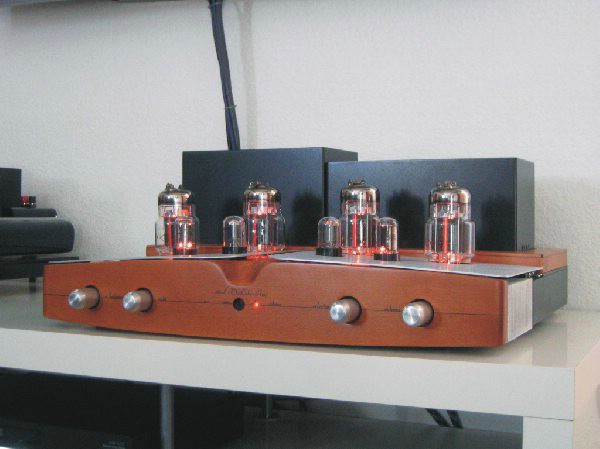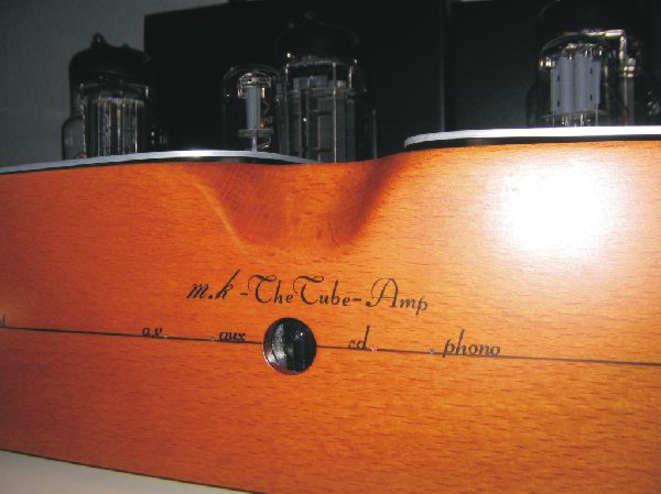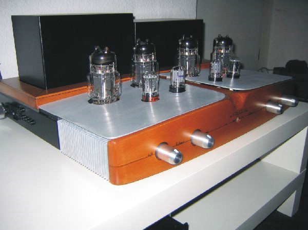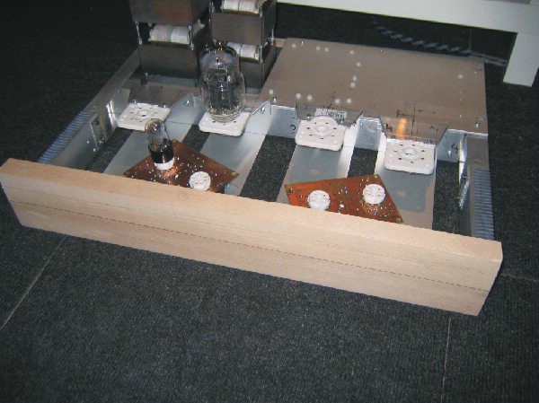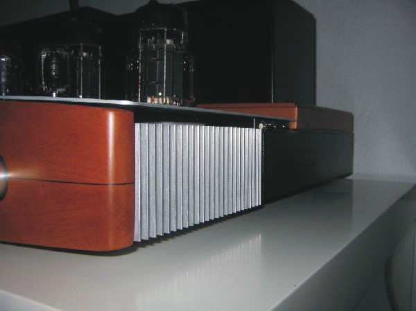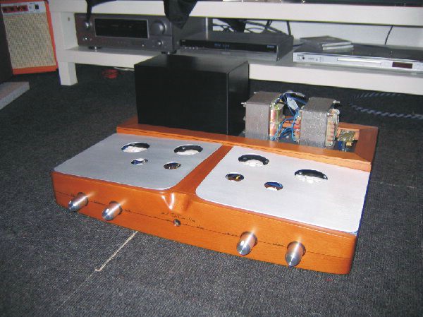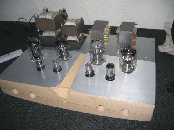 Im Hinteren teil wurde ein Holzrahmen aus Buche auf Birnbaum gebeizt montiert, worin die Trafohauben die ebenfalls aus Aluminium sind Platz finden!