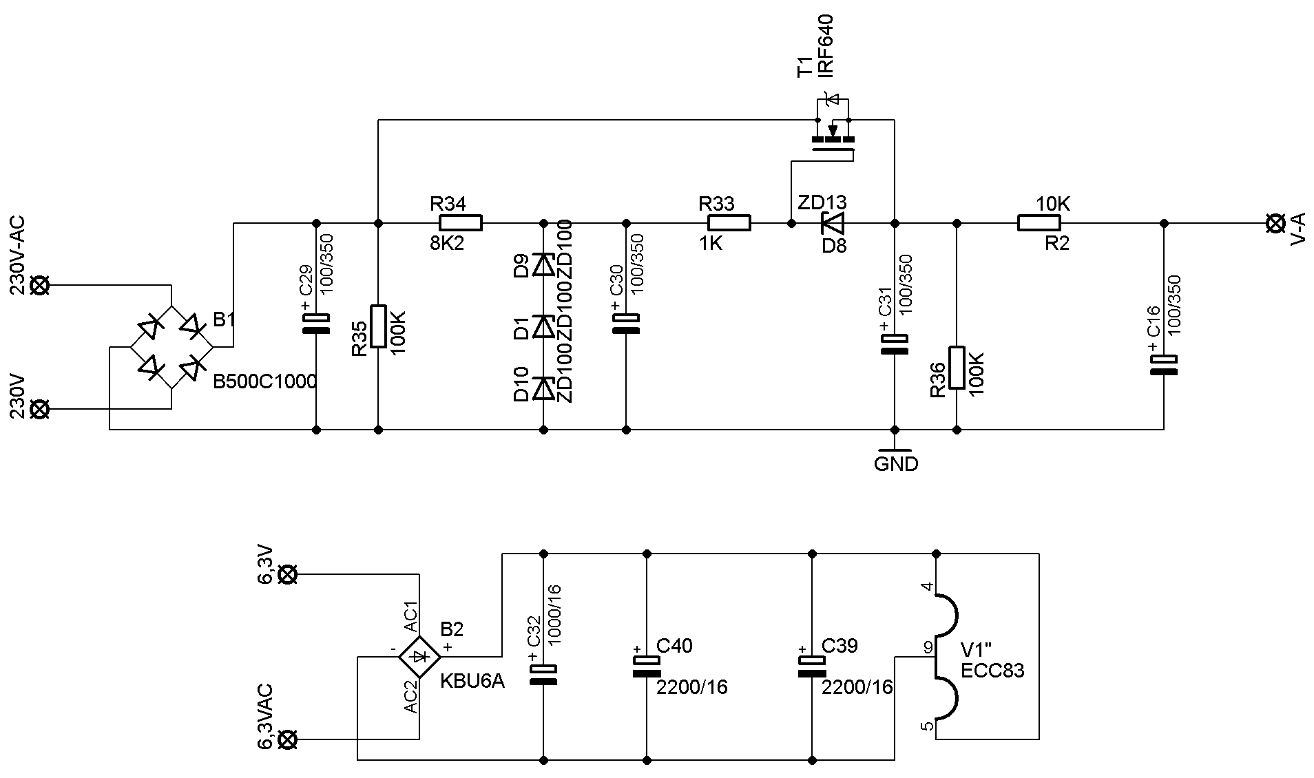 Das Netzteil für die Anodenspannung und für die DC Heizung der ECC 83 zu sehen. 230V AC wird für die Aufbereitung der Anodenspannung benötigt. Die Anodenspannung wird mit den Z Dioden D1, D9, D10 festgelegt. Jede dieser Diode hat einen wert von 100V Summiert man die Werte kommen wir auf einer Gleichspannung von 300V C30 Glättet die Spannung noch einmal D8 ist zum Schutz von T1 Vorgesehen Manche MOS haben bereits eine Schutzdiode im Gehäuse Integriert. In diesen fall kann auf der Diode verzichtet werden. Es Können hier Verschiedene MOS eingesetzt werden wenn nicht gerade in IRF 640 zu beschaffen ist. T1 (IRF 640) benötigt keinen zusätzlichen Kühlkörper, er verursacht nur eine geringe Wärme die nicht zusätzlich Abgeführt werden muss. R 35 sowie R 36 trägt dazu bei die Kondensatoren zu entladen, damit sie keine Restspannung auf Dauer Speichern. Diese Widerstände dienen der eigenen Sicherheit um verletzungs- gefahren zu minimieren. R2 hat gleich Zwei Funktionen. Er Schützt T1 zusätzlich vor Zerstörung und setzt die Anodenspannung noch etwas herunter C16 Übernimmt noch einmal die Siebung.