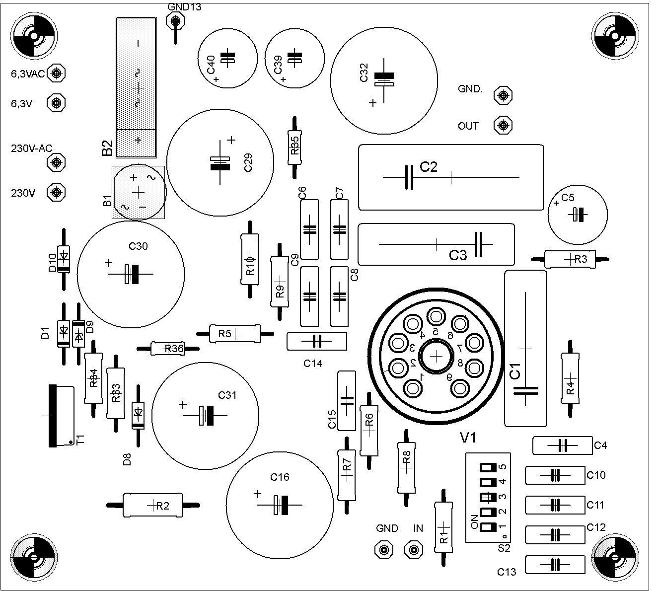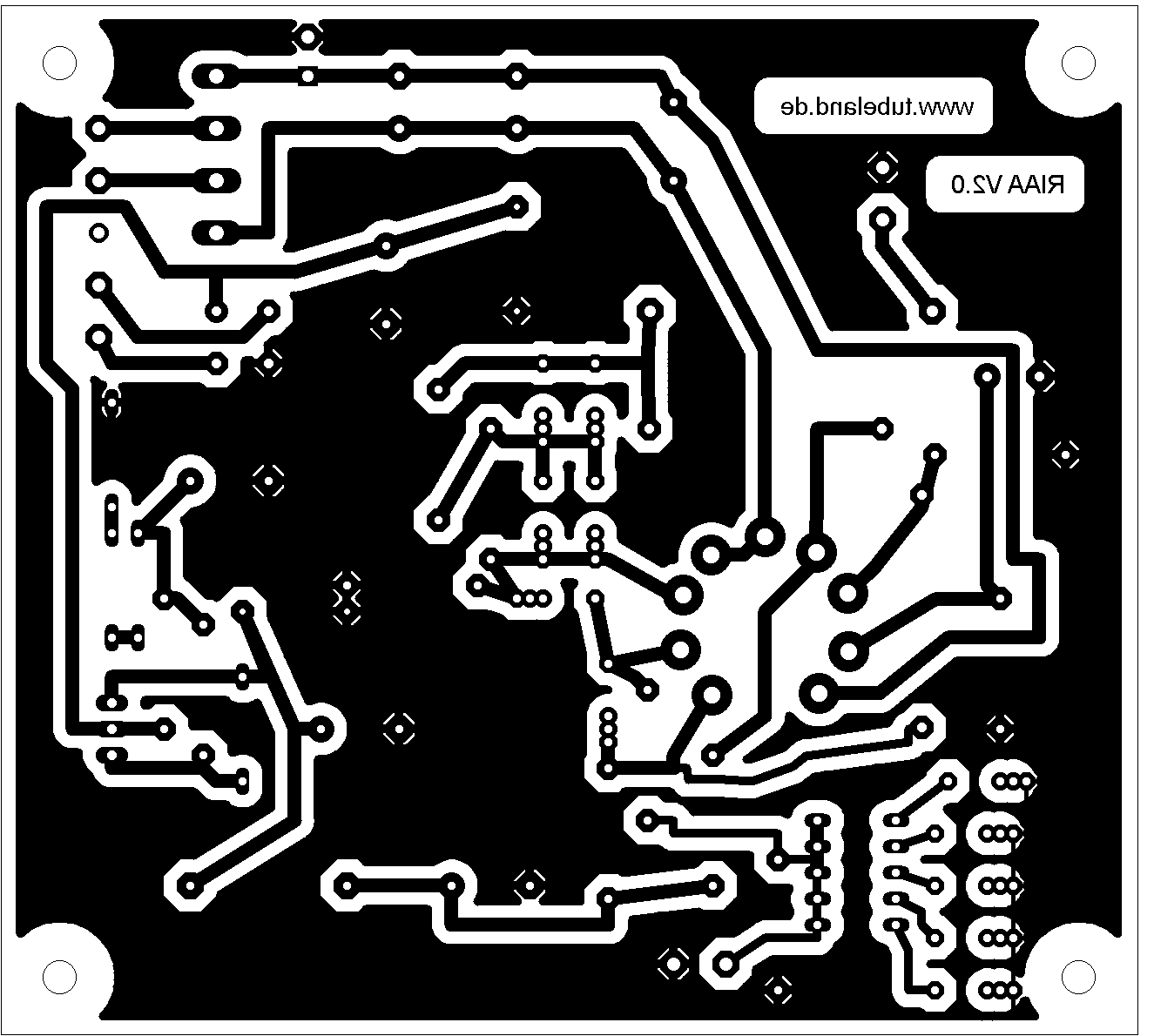 Bestückungsaufdruck des RIAA Entzerrers) Nicht vergessen die Drahtrücke zu setzen um die Masse mit der Heizung zu verbinden!