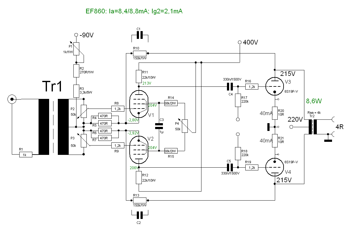 Damit die 6C19П –B voll ausgesteuert werden kann sind am Gitter ca. 160-170Vss erforderlich. Aus der Eingangsspannung von 1Veff werden nach dem Eingangsübertrager knapp 1,5Veff. Die EF860 verstärkt diese Spannung auf ca. 55Veff also 155Vss. Das bedeutet, dass die Endröhre nicht ganz maximal ausgesteuert wird. Dies ist aber nicht so tragisch.