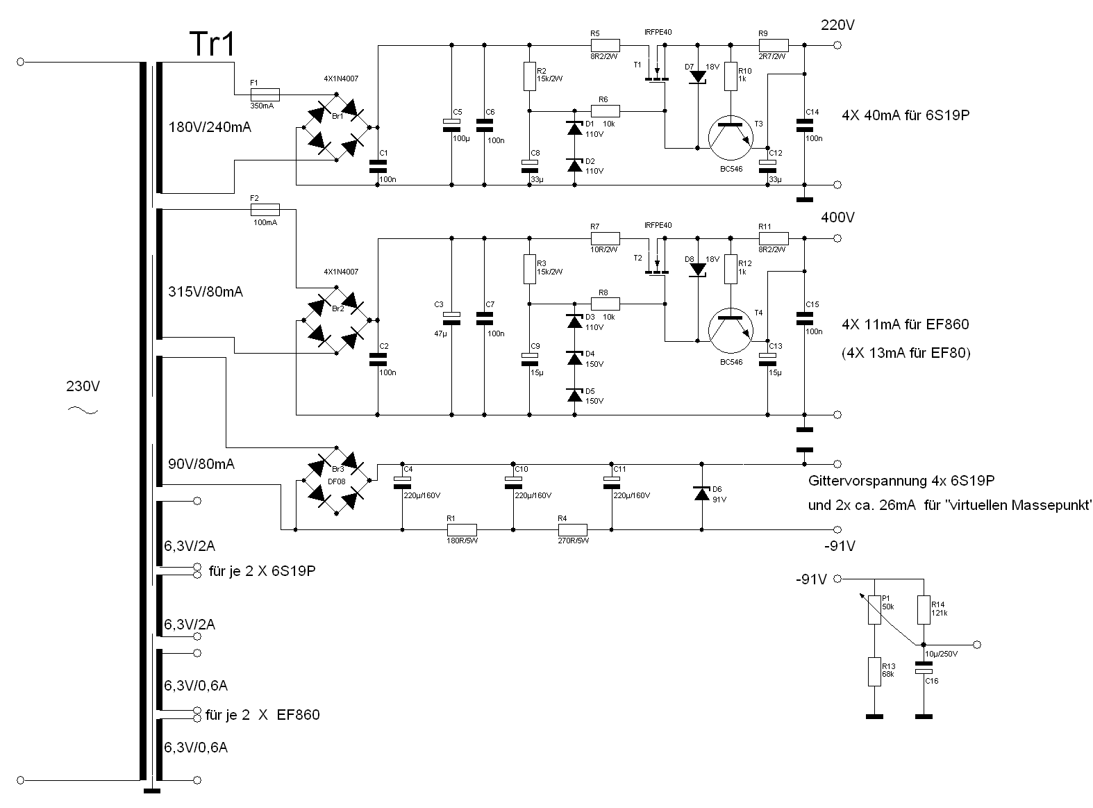 Die negative Gittervorspannung (welche auch am „virtuellen Massepunkt“ zum Einsatz kommt) wird mehrfach gesiebt und mit einer 91V Zenerdiode stabilisiert.