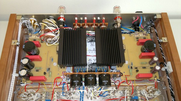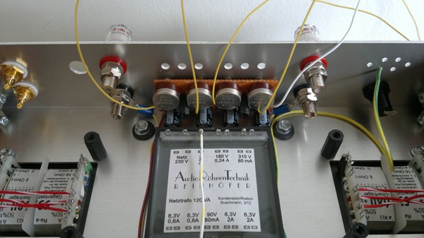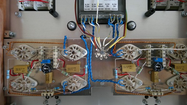 Die Heizspannungen für die Endrören als auch für die Vorröhren sind jeweils kanalgetrennt ausgeführt, und werden mit je zwei 100Ohm Widerständen gegen Masse symmetriert.