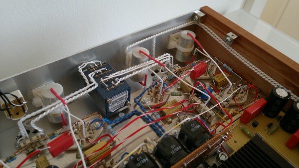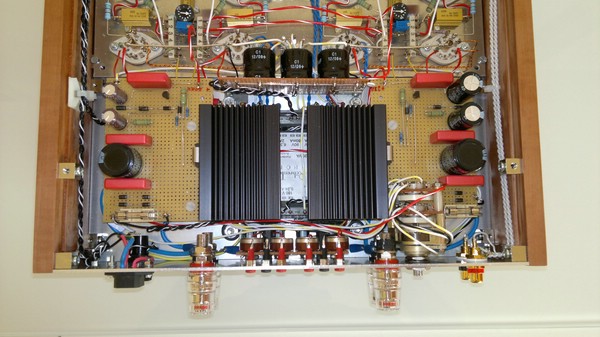 Die komplette Verstärkerschaltung (bis auf die Koppelkondensatoren) baute ich auf einer separaten Aluminiumplatte auf. Diese wurde dann von innen an die entsprechende Stelle des Gehäuses unter Benutzung von Abstandshülsen und Gewindewürfel geschraubt.