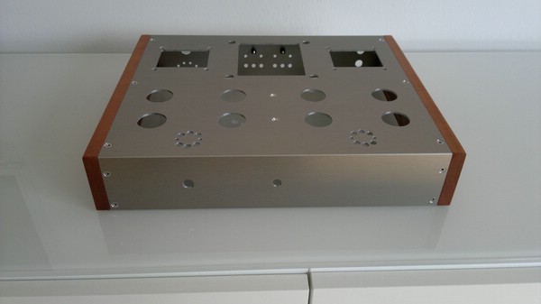Das Gehäuse selbst besteht aus Alunox, welches von meinem Aluhändler 2 mal abgekantet wurde. Die beiden Seitenteile habe ich aus Schweizer Birnbaum befertigt und zum Schluss geölt. Seitenteile und Alugehäuse wurden dann mit Gewindewürfeln befestigt. Diese dienen auch zu Befestigung der Verstärkerplatte und der Lochblech-Bodenplatte.