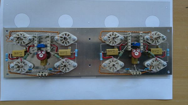 Von den beiden Widerständen R20 und R21 mit je 10Ohm führen Leitungen zu entsprechenden Buchsen auf der Gehäuse Rückseite, um den geforderten Ruhestrom von je 40mA einzustellen. Die hierzu notwendigen Potis sind ebenfalls auf der Rückseite des Gehäuses zu finden. Alle vier Spannungsteilerschaltungen für die feste Gittervorspannung habe ich auf eine kleine Platine gelötet, und diese an der entsprechenden Stelle auf der Innenseite des Gehäuses befestigt.