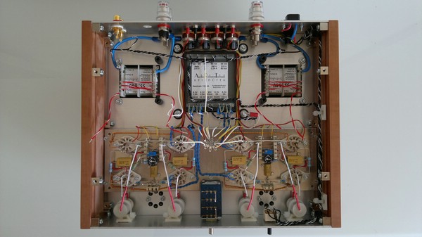 Als Vorstufenröhre wurde die EF860 gewählt (EF80 oder ähnlich ist ebenso möglich). Pro Kanal werkeln jeweils zwei dieser Röhren in Differenzverstärkerschaltung.